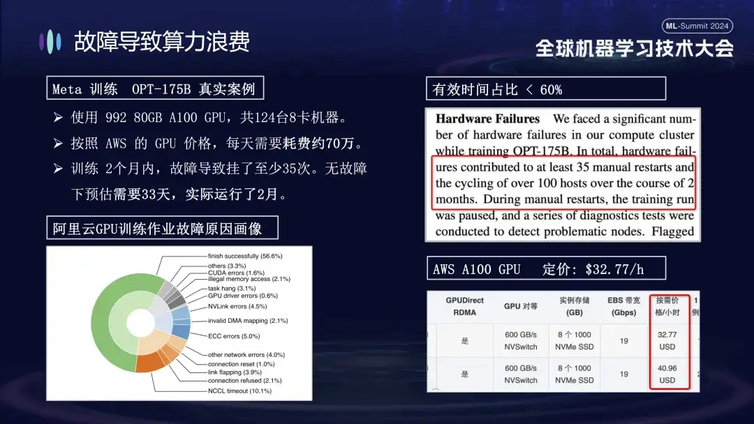 下面的图片展示了在阿里云集群进行大模型训练时遇到的故障分布情况,这些故障有的可以通过重启解决,而另一些则无法通过重启修复。例如,掉卡问题,因为重启后故障卡仍然是损坏的。必须要先更换损坏的机器,才能重新启动并恢复系统。
