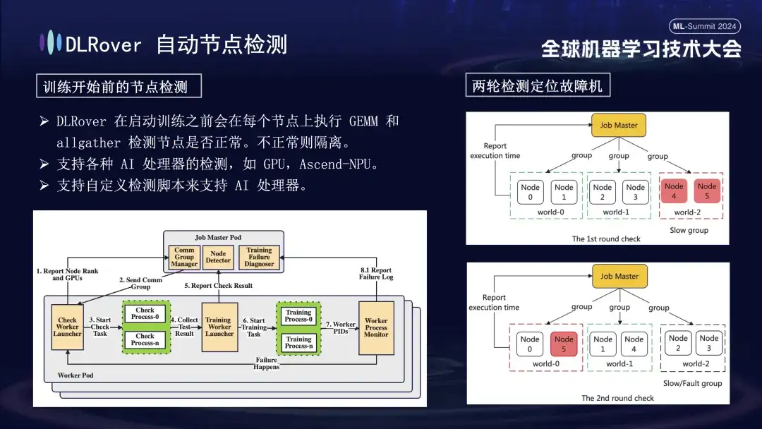 上图是 DLRover 在故障自愈技术上的两大核心功能。首先,通过 Flash Checkpoint 能够在几乎不停止训练流程的前提下快速保存状态,实现高频备份。这意味着一旦遇到故障,系统能够立即从最近的检查点恢复,减少数据丢失和训练时间损耗。其次,DLRover 利用 Kubernetes 实现了智能化的弹性调度机制。该机制能够自动化应对节点故障,例如在 100 台机器的集群中若有一台失效,系统会自动调整至 99 台机器继续训练,无需人工介入。此外,它兼容Kubeflow 和 PyTorchJob,强化了节点健康监测能力,确保在 10 分钟内迅速识别并响应任何故障,维持训练作业的连续性和稳定性。