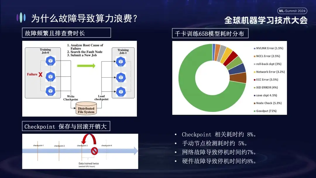 为什么训练故障会造成这么大的影响呢?首先,分布式训练是多个节点协同工作的,任一节点发生故障(无论是软件、硬件、网卡或 GPU 问题),整个训练流程均需暂停。其次,训练故障发生后,排查费时费力,比如现在大家常用的手动检查方式二分法,查一次至少需要 1-2 个小时。最后,训练是有状态的,训练重启需要从之前的训练状态里面恢复再继续,隔一段时间就要保存训练状态。而保存的过程耗时很长,而且故障回滚也会造成计算的浪费。上方的右图展示了我们上线故障自愈之前的训练耗时分布,可以看到 Checkpoint 的相关时间占比大概是 8%,手动节点检测的时间占比大概是 5%,网络故障导致停机时间约 7%, 硬件故障导致停机时间约 8%,最终有效训练时间大概只有 72%。