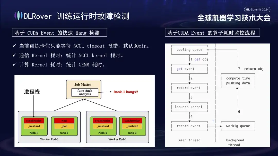 前面讨论了系统中断与故障检测的情况,但还需解决机器卡死的识别问题。NCCL 设置的默认超时时间为 30 分钟,允许数据重传以减少误报,然而这可能导致实际卡顿时,每张卡白白等待 30 分钟,累计起来损失巨大。为精确诊断卡死,建议采用一种精细化的 profiling 工具。当监测到程序暂停推进,例如一分钟内程序栈无变化,即记录各卡的栈信息,对比分析差异。例如,若发现 4 台 rank 中有 3 台执行 Sync 操作,而 1 台执行 wait 操作,即可定位该设备存在问题。进一步,我们将关键的 CUDA 通信 kernel 和计算 kernel 进行劫持,在其执行前后插入 event 监控,通过计算事件间隔来判断运算是否正常进行。例如,若某运算超过预期的 30 秒仍未完成,可视为卡死,并自动输出相关日志及调用栈,提交至 master 进行对比,迅速定位故障机器。