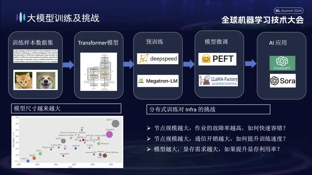 大模型训练基本流程如上图所示,需要经过训练样本数据集的准备,Transformer 模型的构造,预训练,模型微调,最终构建成为用户 AI 应用。随着大模型从十亿参数迈向万亿参数,训练规模的增长导致了集群成本的飙升,同时也影响了系统的稳定性。如此规模的系统带来的高额运维成本,成为了大模型训练过程中亟需解决的问题。