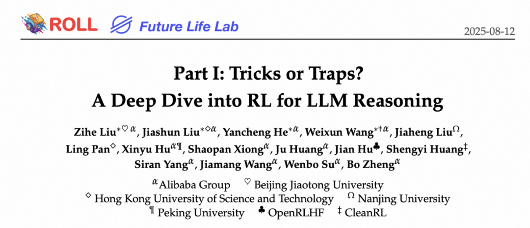 阿里巴巴淘天集团和爱橙科技联合多所高校,基于自研并开源的 RL 框架 ROLL, 开展了系统化研究。本研究由淘天集团算法技术—未来生活实验室与爱橙科技智能引擎事业部联合完成,核心作者刘子贺,刘嘉顺, 贺彦程和王维埙等。未来生活实验室汇聚淘天集团的算力、数据与顶尖技术人才,专注于大模型、多模态等前沿 AI 方向,致力于打造基础算法、模型能力及各类 AI Native 应用,引领 AI 在生活消费领域