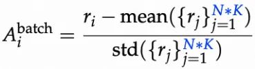 - 批次归一化(Batch-level):对整个批次内的 N*K 个响应进行奖励归一化,利用更大样本估计方差,抑制极端样本主导梯度。