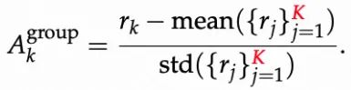 - 组内归一化(Group-level):同一问题的 K 条响应之间做对比,强化组内相对优劣。