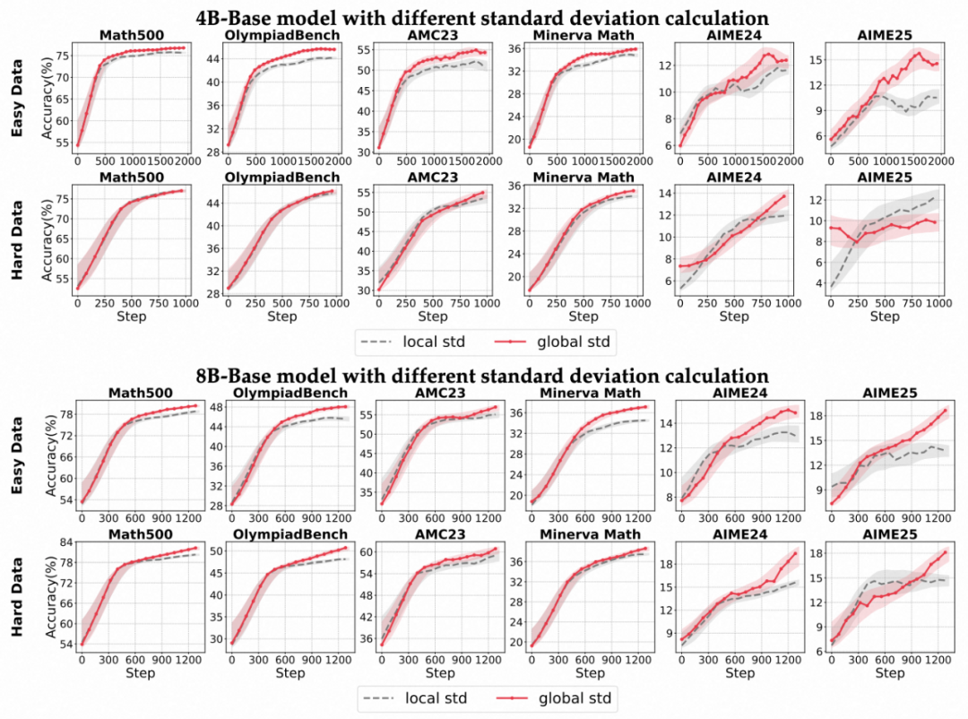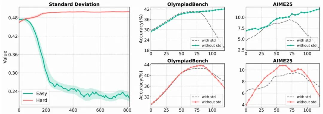 - 当样本奖励分布高度集中的场景下(例如简单数据集下几乎全对的样本分布),标准差极小会放大梯度,导致训练不稳定乃至崩溃。