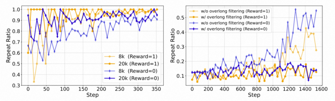 - 通过对过滤掉的样本类型进行统计,发现引入 Overlong Filtering 能够降低训练中 “不能正确预测 EOS 导致重复生成” 的比例(repeat-ratio),这表明其增强了模型的终止建模能力。