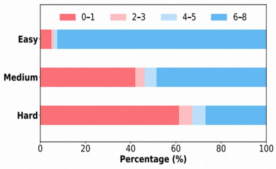 各难度数据集中 rollout 8 次的正确次数分布。