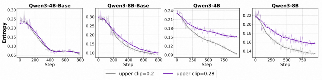 - 对于对齐后的 Instruct 模型,提升上剪裁阈值(ε_high)能有效减缓熵值下降,促进探索。。