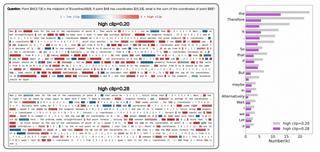左图:不同裁剪上限下的 token ratio 可视化展示。右图:出现频率最高的前 20 个被剪裁的 token
