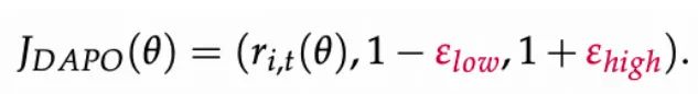 - Clip-Higher:DAPO 提出将上界放宽(上行允许更大更新,下行保持保守),给 “潜力 token” 更大爬升空间,缓解熵塌陷,促进结构性探索。
