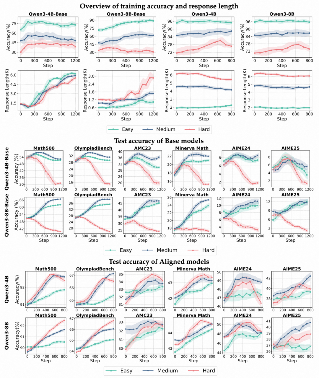 - 多种场景覆盖:涵盖不同模型规模(4B/8B)、模型类型(Base 模型 与 Instruct 模型)、任务难度(Easy/Medium/Hard)下的实验分析。训练集从开源数据集(SimpleRL-Zoo-Data, DeepMath 等)中采样过滤,按照难度等级划分为为:Easy, Medium, Hard