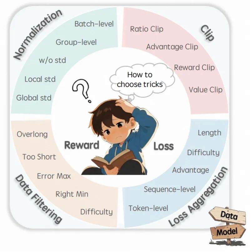 - 给开发者的建议:别再追求 “trick 大全”,应根据模型类型(Base/Align)、任务特性(长度、难度)、奖励设计等实际需求,有针对性地配置合理技巧。