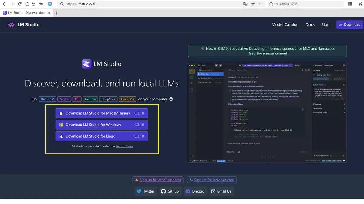 LM Studio也是一款开源软件。进入LM Studio官网(lmstudio.ai),选择系统对应版本的客户端,下载安装即可。