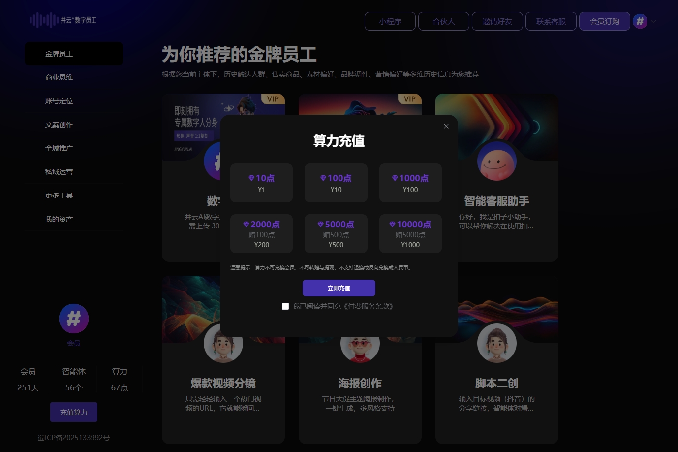 井云平台支持自定义会员套餐,开发者可根据智能体特性设置日卡、月卡、年卡或按次计费。例如: