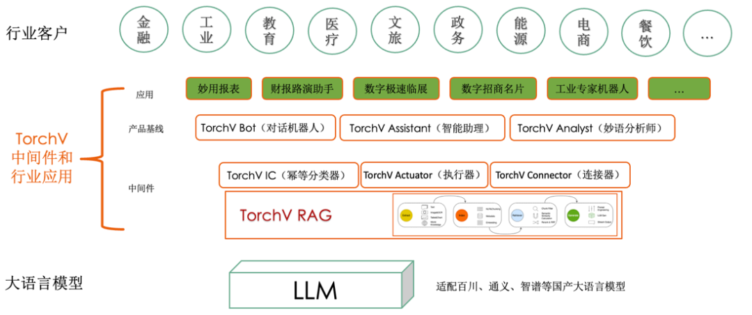从图中可以看到,Torch RAG定位为中间件,和底层国产大模型一起为TorchV Bot、TorchV Assistant以及TorchV Analyst三款基线产品提供基于智能知识库的能力。