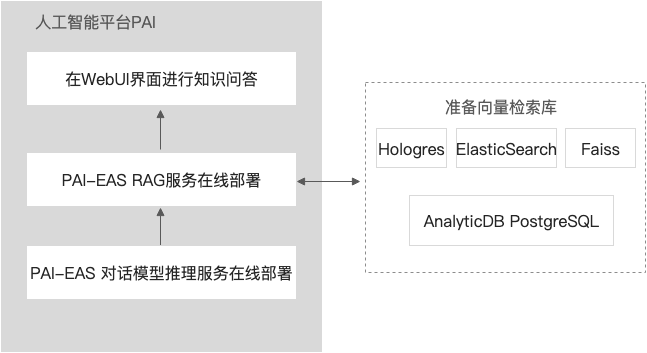 1、准备向量数据库,支持Faiss、Hologres、AnalyticDB for PostgreSQL、Elasticsearch;