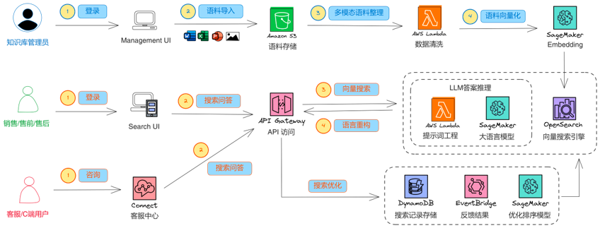 企业内部售前、售后人员等其他角色:通过内部搜索平台发起提问,以查询 IT/HR 等企业内部信息。搜索请求将由 Amazon API Gateway 接收,传送至 Amazon OpenSearch 或 Amazon Kendra 向量知识库进行搜索。搜索返回的结果,会通过部署在 AWS Lambda 上的 LangChain 进行提示词工程的处理,再由部署于 Amazon SageMaker 的大语言模型最终产生答案,并返回给用户。