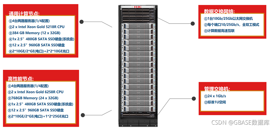 新华三基于GBASE分布式数据库所打造的“硬”实力一体机架构、配置,在性能上既能针对OLAP应用场景,适合海量数据仓库、实时业务分析系统、深度分析数据集市等场景,又能以“工业标准硬件+冗余架构设计+开放式系统平台”,实现高性能、高可靠、易扩展、广兼容等价值。通过高性能的10Gb/25Gb以太网,将高性能X86服务器、灵活的进行组合,使其软硬件融合组成高性能计算和存储资源池。