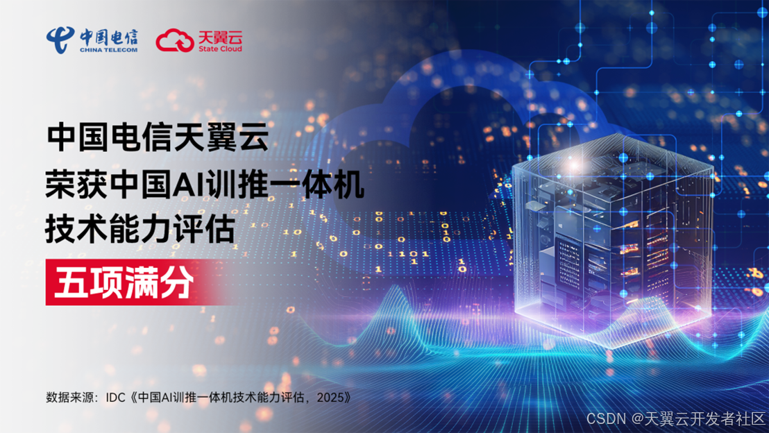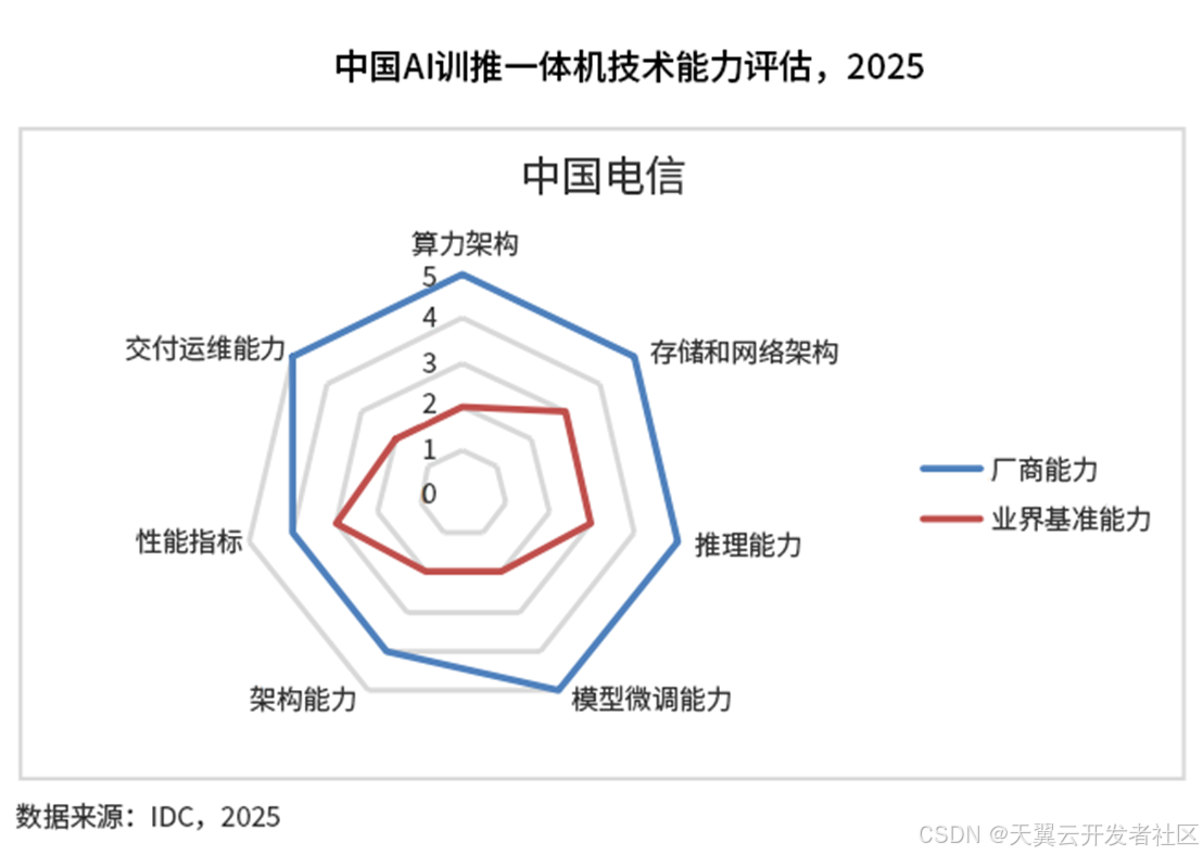 近日,国际数据公司IDC发布《中国AI训推一体机技术能力评估,2025》。报告显示,中国电信天翼云在中国AI训推一体机技术能力评估中,算力架构、模型微调能力、推理能力、存储和网络架构、交付运维能力五项评估维度均获得满分,强势跻身第一梯队,展现出国云领先的技术实力。