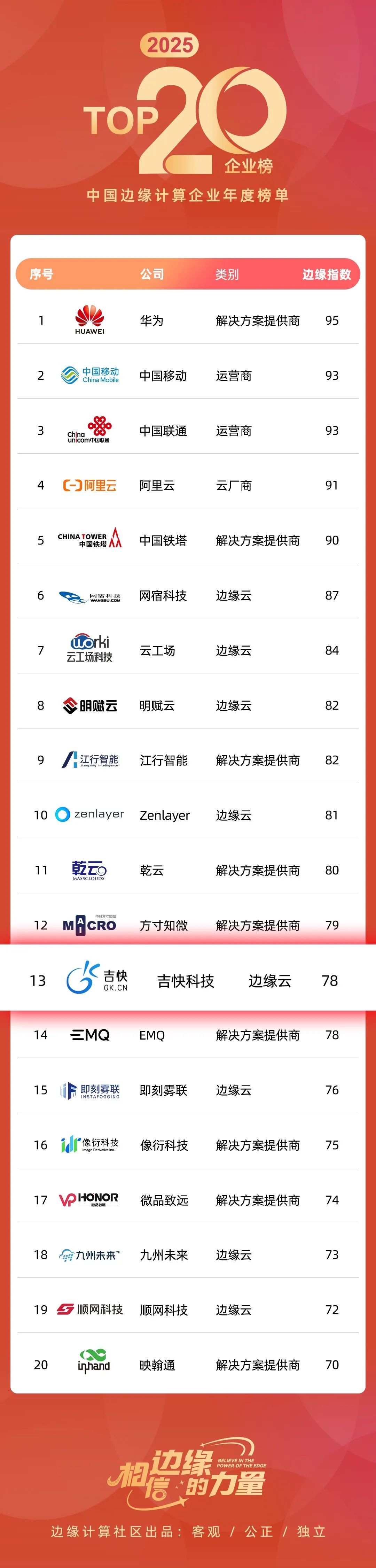 4月8日,备受瞩目的"2025年边缘计算20强企业榜单"正式揭晓。凭借在边缘计算领域的卓越创新与显著影响力,吉快科技成功蝉联"中国边缘计算企业20强"殊荣,排名较上年稳步提升,彰显了公司在行业内的领先地位。