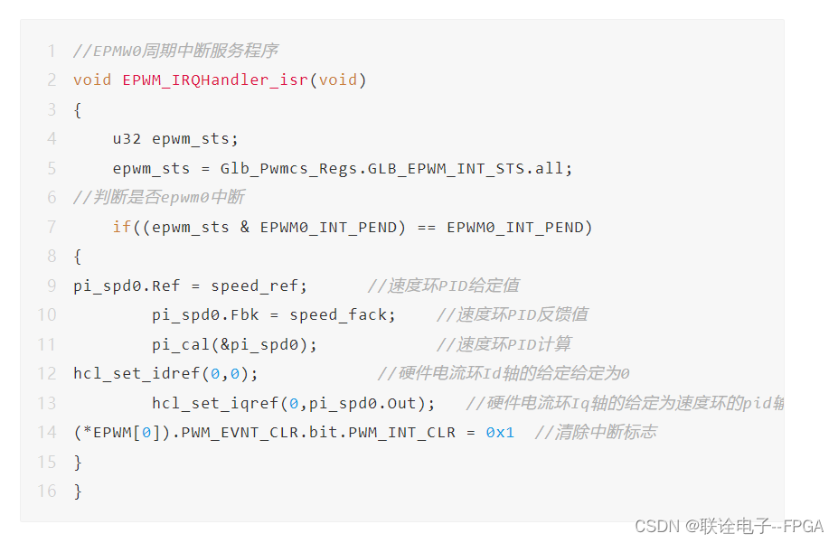 第三步 在EPWM中断服务程序里面给硬件电流环赋值;本例中采样EPWM0,中断周期为100us,将速度环PID输出值赋给硬件环即可,剩下的电流环算法自动由硬件完成,无需CPU干预。