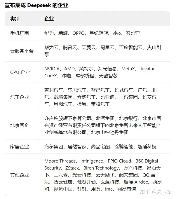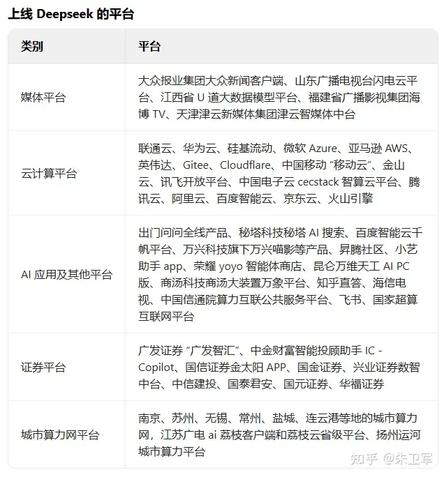为什么说DeepSeek是平台型应用?你想想看,从25年春节到现在才一个月不到,宣布上线或集成DeepSeek的公司不下数百家,上到国家数据平台,下到地方算力中心,从互联网企业到三大运营商,从手机厂商到汽车制造业,都在上赶着宣布与DeepSeek合作,这种盛况,连当年的微信、苹果初代机也望尘莫及啊。