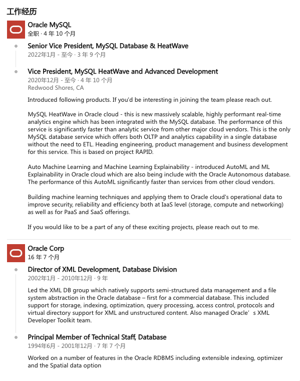 MySQL Heatwave 的负责人是尼彭·阿加瓦尔(Nipun Agarwal)。他的工作履历上显示,自2022年,MySQL团队和HeatWave团队就都已经在他的管辖范围内了。