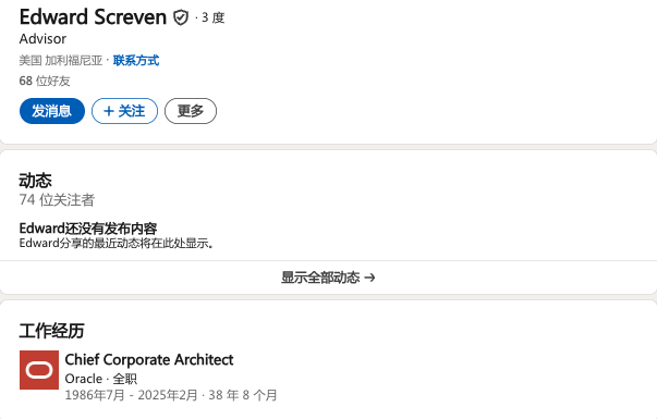 爱德华·斯克里文为Oracle工作了38年,退休前的职务是执行副总裁和首席企业架构师。他在Oracle公司也向拉里汇报,下辖1万多人。