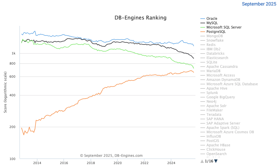 流行度排行榜上保持持续上升趋势的是PostgreSQL,随着AI时代对于开源PostgreSQL的需求持续增加,两者在流行度上交叉的时刻可能在未来3年内到来。