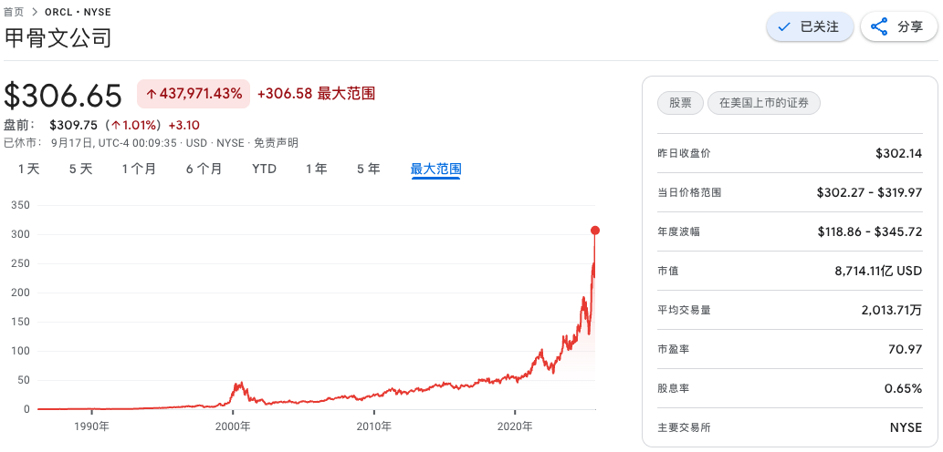 首先,Oracle公司借助AI算力的浪潮,让Oracle Cloud跟上了时代热点,这直接推动Oracle公司的股价大幅上扬,最高公司市值曾突破9000亿美元。在股价最高点时,拉里超过了马斯克,一度登顶全球首富的宝座。