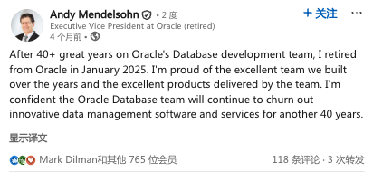 我刚刚注意到Oracle公司负责“Oracle数据库”产品研发的负责人、一度被称为“Oracle数据库掌门人”的安迪·门德尔松(Andy Mendelsohn)已经于2025年1月退休。