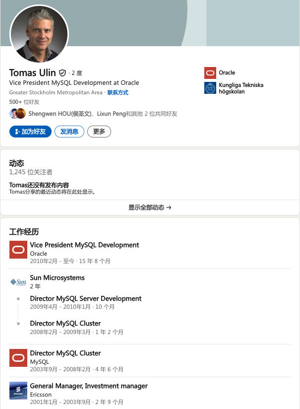 在Oracle公司内部,MySQL的研发负责人是 托马斯·乌林(Tomas Ulin),在Oracle工作也已经超过了20年。