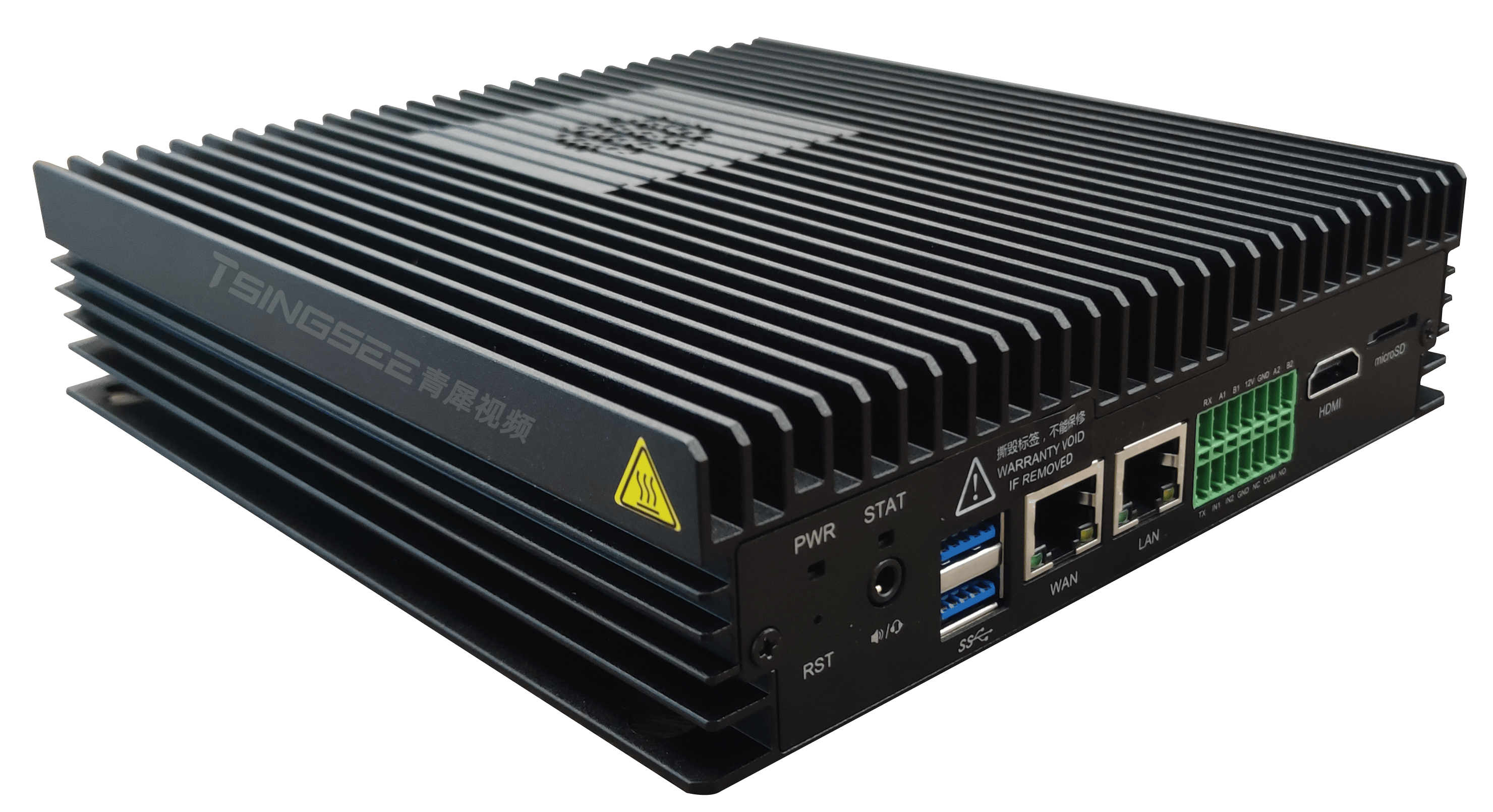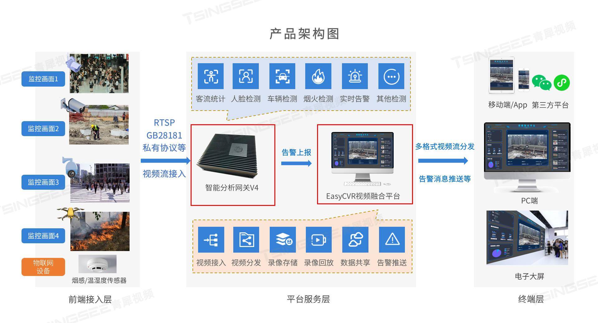 以TSINGSEE青犀AI智能分析网关V4为例,该硬件属于边缘智能,支持近40种AI算法模型,支持对接入的视频图像进行人、车、物、行为等实时检测分析,上报识别结果,并能进行语音告警播放。