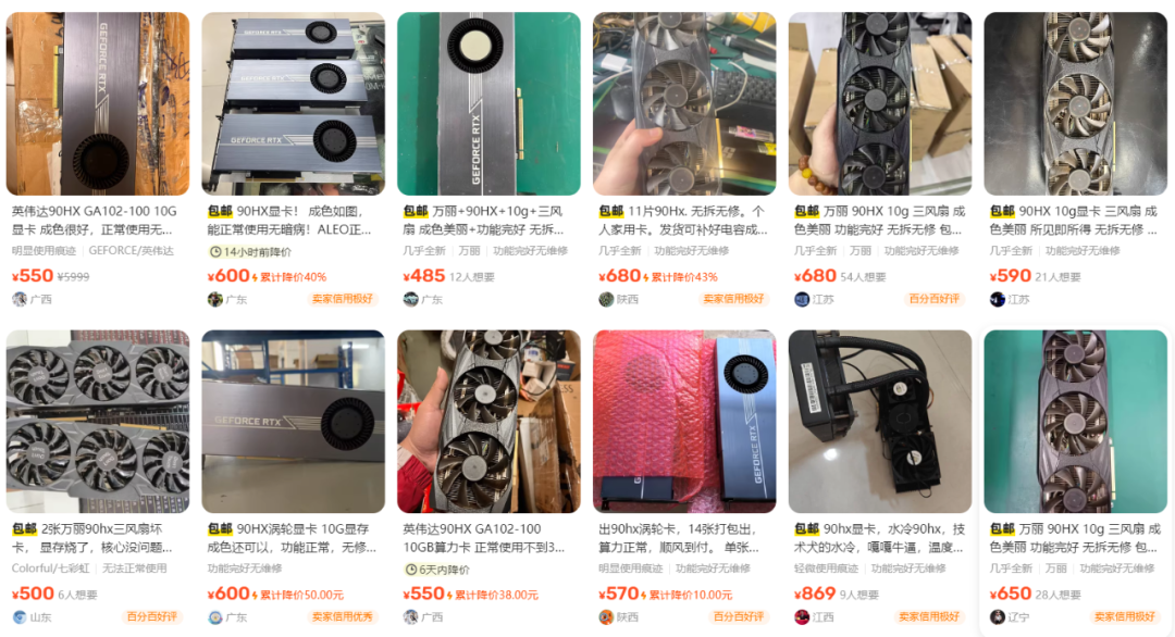 矿难时期的显卡足以令人疯狂乃至令普通人抓狂,虽然矿难过去已久,但其带来的后遗症还是很明显的,比如二手默认矿卡!其实本身矿渣显卡并不可怕,可怕的是此类显卡的高溢价,什么杨的显卡就应该匹配什么样的价格,然而事与愿为,基本上大部分矿渣显卡卖出了天价。甚至有极端直接就认证矿卡购买,就问你头够不够铁。比如有刷到这样一款显卡大量流出于咸鱼二手市场,妥妥的矿渣显卡,管你是从哪里接盘使用,这就是90HX显卡!
