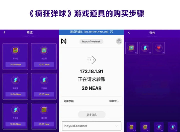 《疯狂弹球》游戏道具的购买步骤:在《疯狂弹球》里的游戏商场可以选择NFT游戏道具(每款道具都有不同功能),并通过NEAR钱包进行购买,购买后的游戏产品将在“我的背包”里显示。