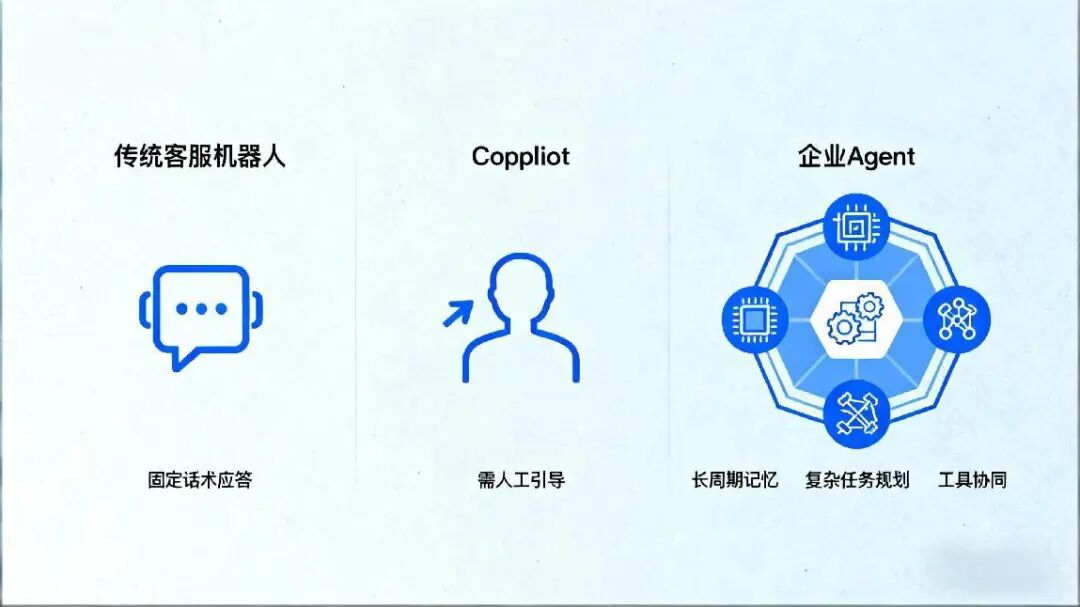 准确来说,企业Agent是基于大模型技术,集“感知-思考-决策-执行”于一体的企业级智能系统。它能够以自然语言为交互入口,理解企业复杂业务需求,自主拆解任务目标,调用内部系统接口、外部工具与数据资源,完成端到端的业务流程,甚至在遇到突发状况时动态调整执行方案。与仅能完成固定话术应答的Chatbot、需要人工引导才能推进工作的Copilot相比,企业Agent的核心优势在于“自主性”与“闭环能力”。