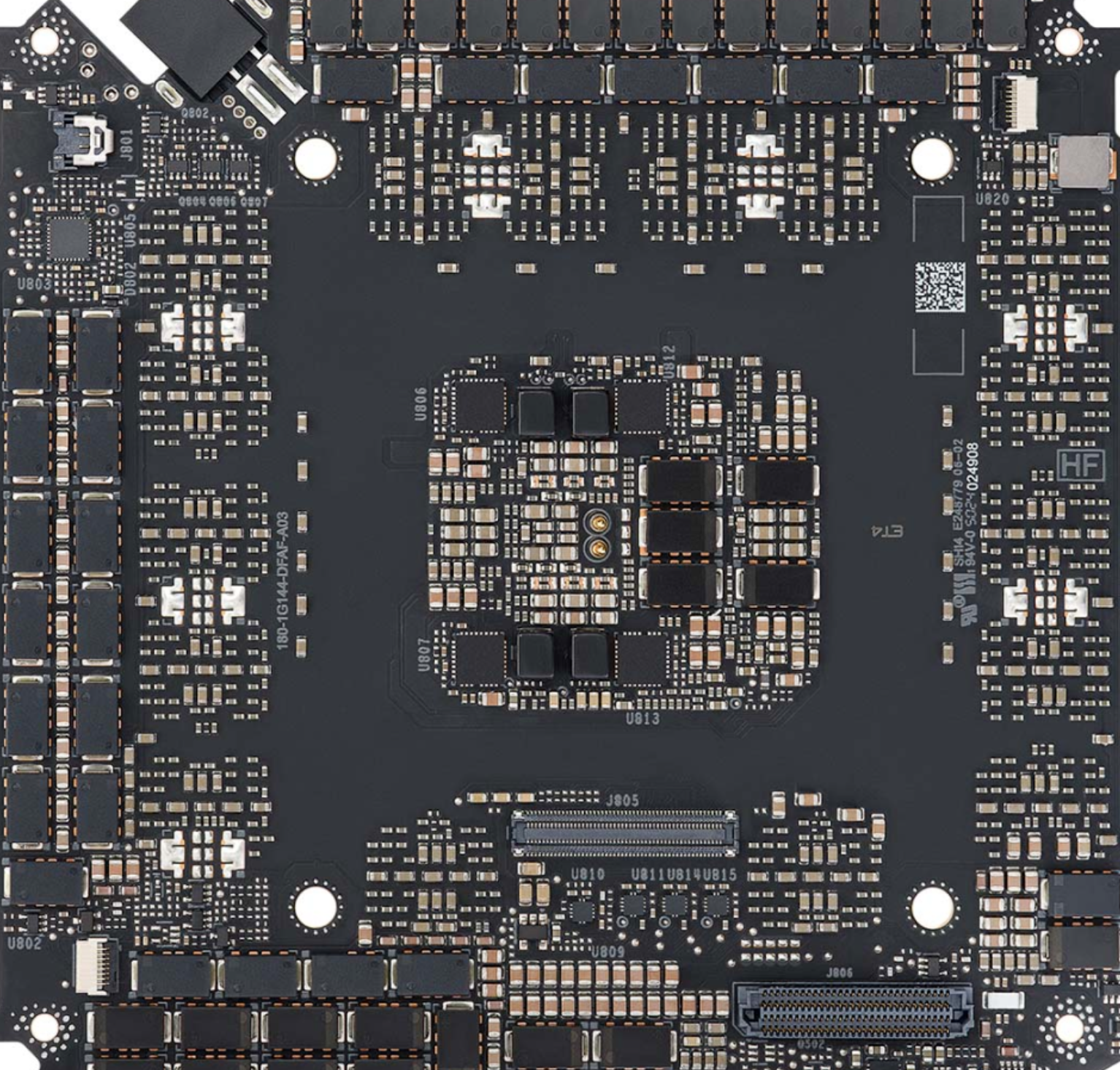 而RTX 5090 PCB板背面,熟悉的配方,单面没有任何显存颗粒: