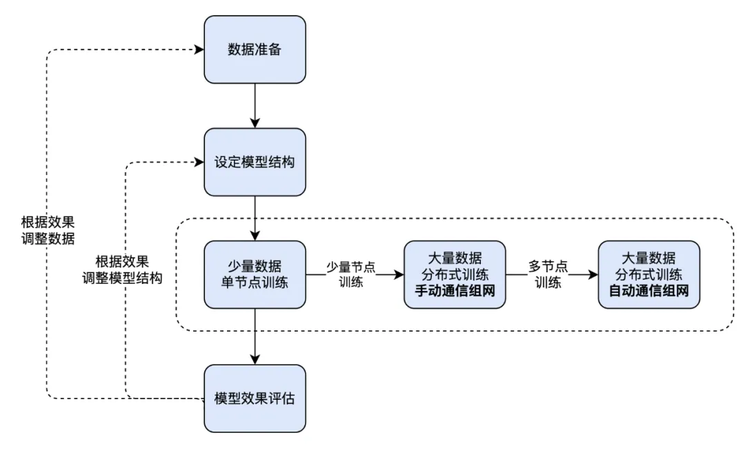 2.从单机到多机分布式训练实践:模型训练往往是模型开发全流程中最耗时、最消耗算力资源的阶段。为了兼顾效率与成本,我们将按以下流程进行: