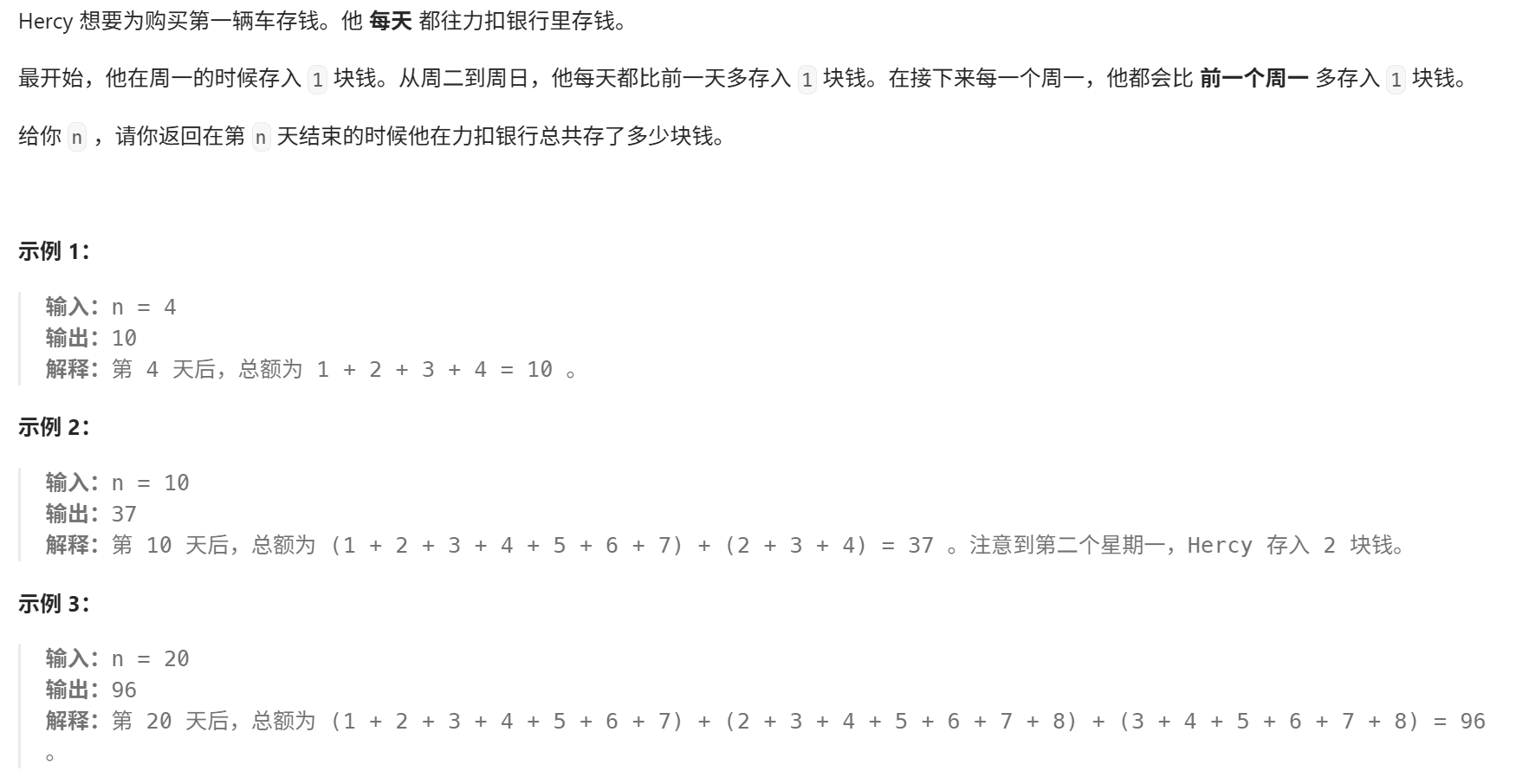 2>循环计算不足一周的总钱数,第一天的钱数为week+1,依次递增+1,直到day天累加完,循环结束;<1>首先,计算不足一周的天数day,day=n%7;<1>week表示存够整周的周数,week=n/7;第i周存钱的钱数=28+(i-1)*7;分开计算,最后求二者的总和,即为所求。的方法来解决这个问题,将。