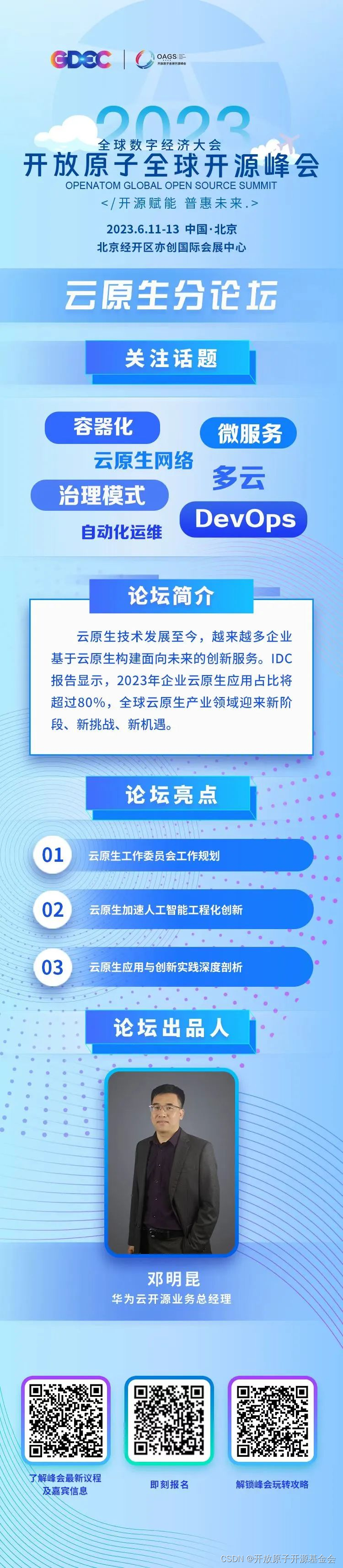 2023开放原子全球开源峰会云原生分论坛将邀请北京航空航天大学软件学院院长胡春明、华为云开源业务总经理邓明昆,以及来自中国移动、滴滴、阿里云、华为云、腾讯星辰算力平台、第四范式、通明智云等企业技术负责人,基于各自在数字创新过程中遇到的挑战,就如何使用云原生技术与产品实现跨越式发展发表演讲。