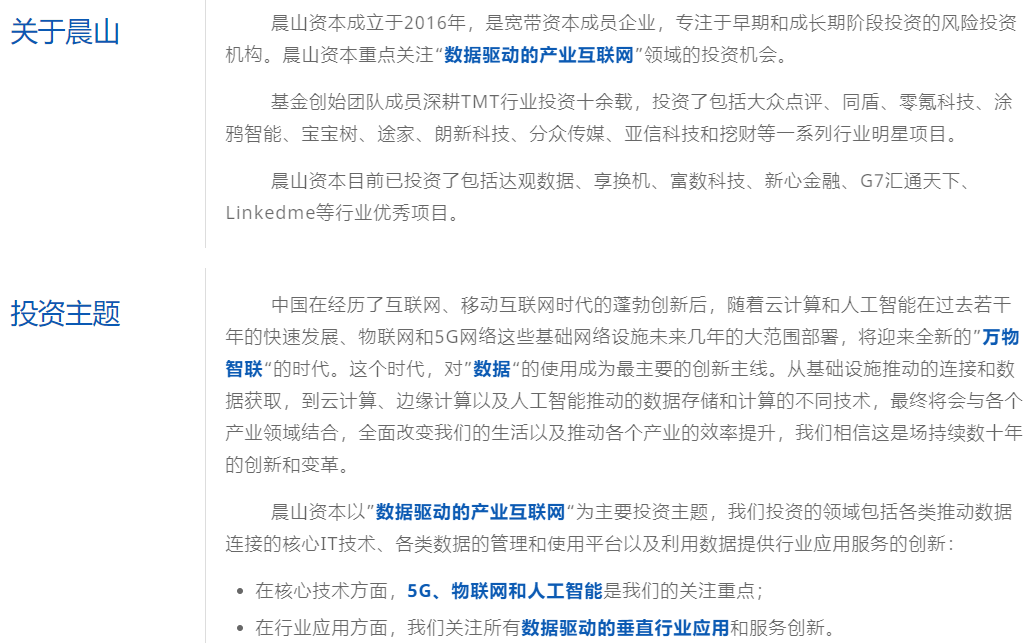王志飏是晨山资本合伙人,主要关注 AIOT 方向的投资,重点包括 5G 和物联网、IT 基础技术、工业互联网等领域。