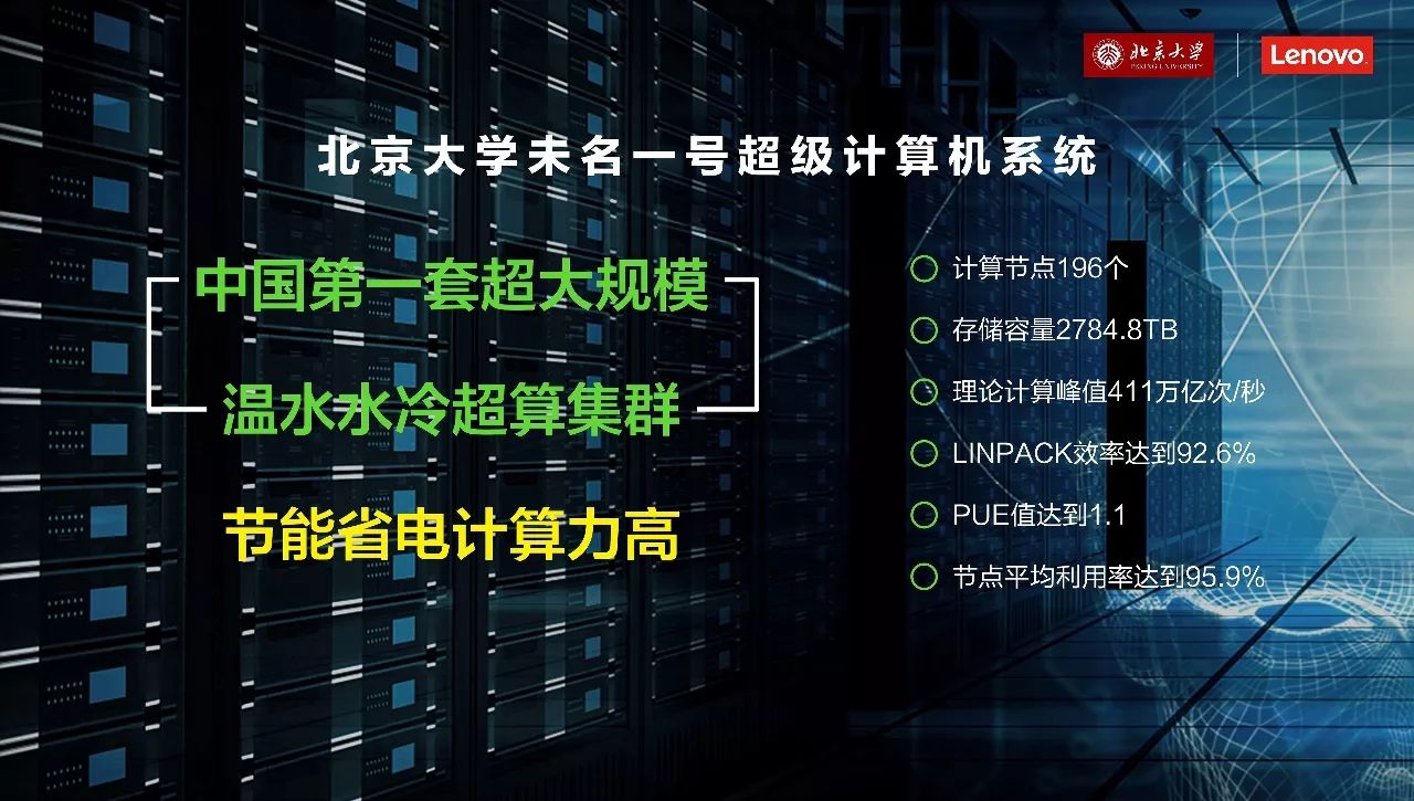 在北京大学物理学院副教授、北京大学高性能计算校级公共平台主任雷奕安看来,相比传统的风冷散热技术,采用联想45℃温水水冷技术的“未名一号”,LINPACK效率达到92.6%,PUE值控制达1.1。同时,“未名一号”还节省了50%的制冷散热成本,每年将为北京大学节省60万度电。