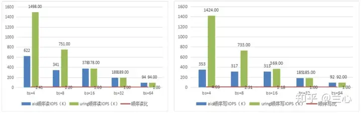 测试结果:顺序读/写时,数据块在4K、8K、16K、32K、64K情况下,会随着数据块的增大而性能提升而降低,但IO_URING对比AIO性能在4K、8K时有明显提升。