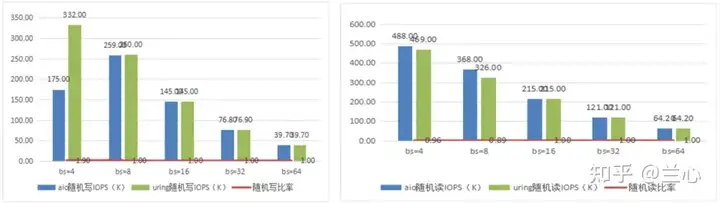 测试结果:随机写时,数据块在4K、8K、16K、32K、64K情况下,会随着数据块的增大而性能提升而降低,但IO_URING对比AIO性能在4K时有明显提升;随机读时,数据块不会随着数据块的增大而性能提升而发生明显变化,但性能基本持平。