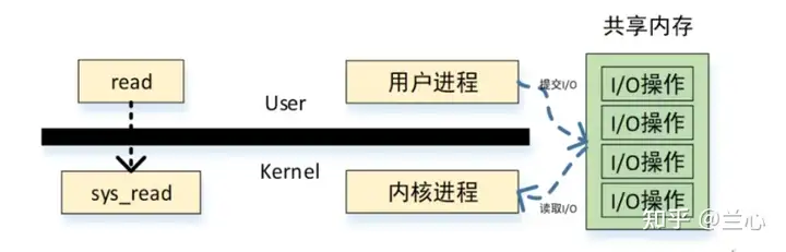 下图中左边部分为AIO的简化示意图,所有的操作都是通过系统调用完成的;右边部分为IO_URING简化示意图,IO_URING 只是将请求放入队列,保证了应用永远不会阻塞;为了最大程度的减少系统调用过程中的内存拷贝,IO_URING采用了将内核态地址空间映射到用户态的方式。用户态程序可以直接操作这两个队列来向内核发送IO请求,接收内核完成IO的事件通知,不需要通过系统调用传递。