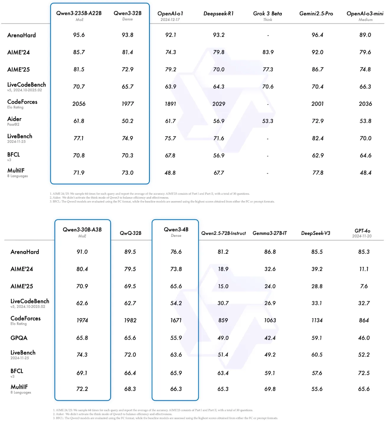 Qwen3 旗舰模型 Qwen3-235B-A22B 在代码、数学、通用能力等基准测试中,与 DeepSeek-R1、o1、o3-mini、Grok-3 和 Gemini-2.5-Pro 等顶级模型相比,表现出极具竞争力的结果。此外,小型 MoE 模型 Qwen3-30B-A3B 的激活参数数量是 QwQ-32B 的 10%,表现更胜一筹,甚至像 Qwen3-4B 这样的小模型也能匹敌 Qwen2.5-72B-Instruct 的性能,以下是测试报告: