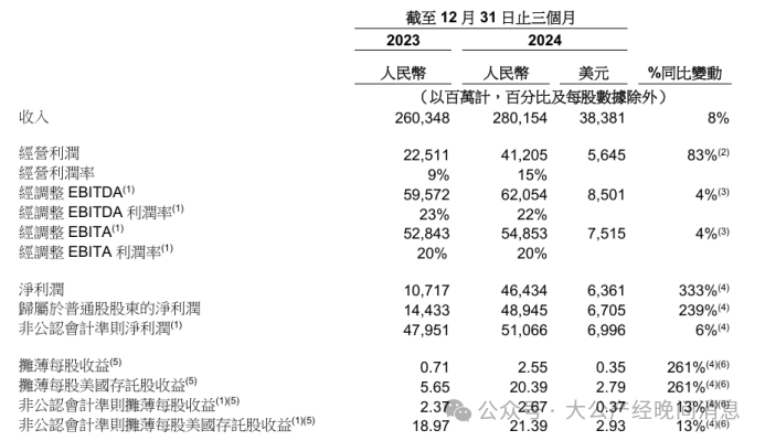 阿里巴巴在财报中表示,在本季度,公司出售在高鑫零售的全部权益,交易金额最高为123亿港元(16亿美元),以及银泰的全部权益,交易金额约74亿人民币(10亿美元)。我们将增加在AI应用研发和算力方面的投入,将AI深度融入各项业务,抓住AI时代的新增长机遇。我们将大幅增加在AI基础模型方面的研发投入,以保持技术领先地位,并推动原生AI应用的发展。财报发布后的电话会上,阿里巴巴集团CEO吴泳铭表示,面向
