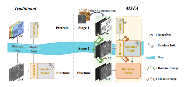 利用这个高质量数据集,我们开展了全面的实验,并揭示了SAR目标检测预训练中的一个关键挑战:在RGB数据集上预训练与在SAR数据集上微调之间,在数据域和模型结构方面均存在显著差异。为弥合这些差距,我们提出了一种新颖的带滤波器增强的多阶段(MSFA)预训练框架,该框架从数据输入、域转换和模型迁移的角度解决了这些问题。因此,它增强了跨域知识的对齐和可迁移性。SAR目标检测的一个主要障碍是,将在自然RGB