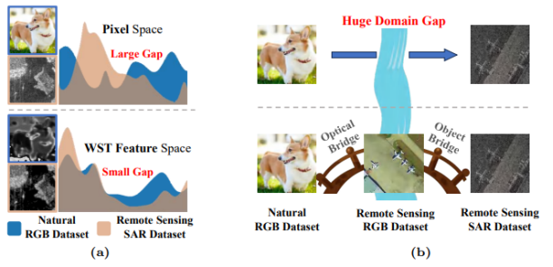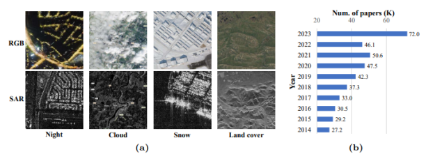 凭借其宝贵的优势,SAR目标检测领域越来越受到关注。近年来,专注于该领域的研究论文数量大幅增加,如图1(b)所示。尽管影响力日益提升,但该研究领域仍面临资源有限和迁移差距等重大挑战。