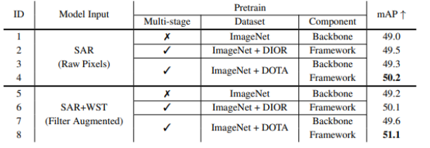上表中实验2、4、6和8的结果证明了两阶段预训练方法的显著优势。值得注意的是,即使是相对小规模的DIOR数据集,与基准(实验1和5)相比也展现出明显的性能提升。这一观察凸显了在SAR检测预训练阶段缩小域差距的重要性。